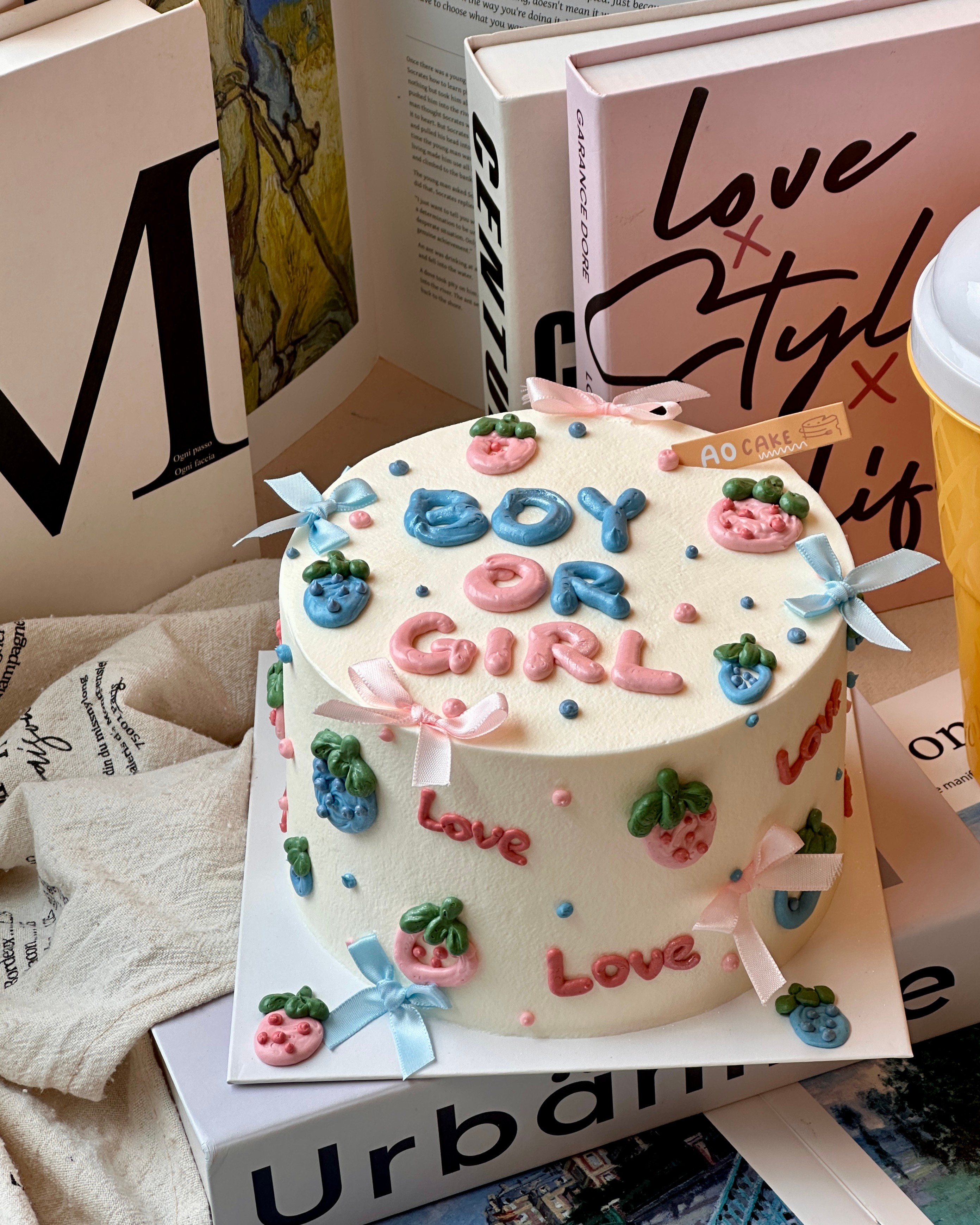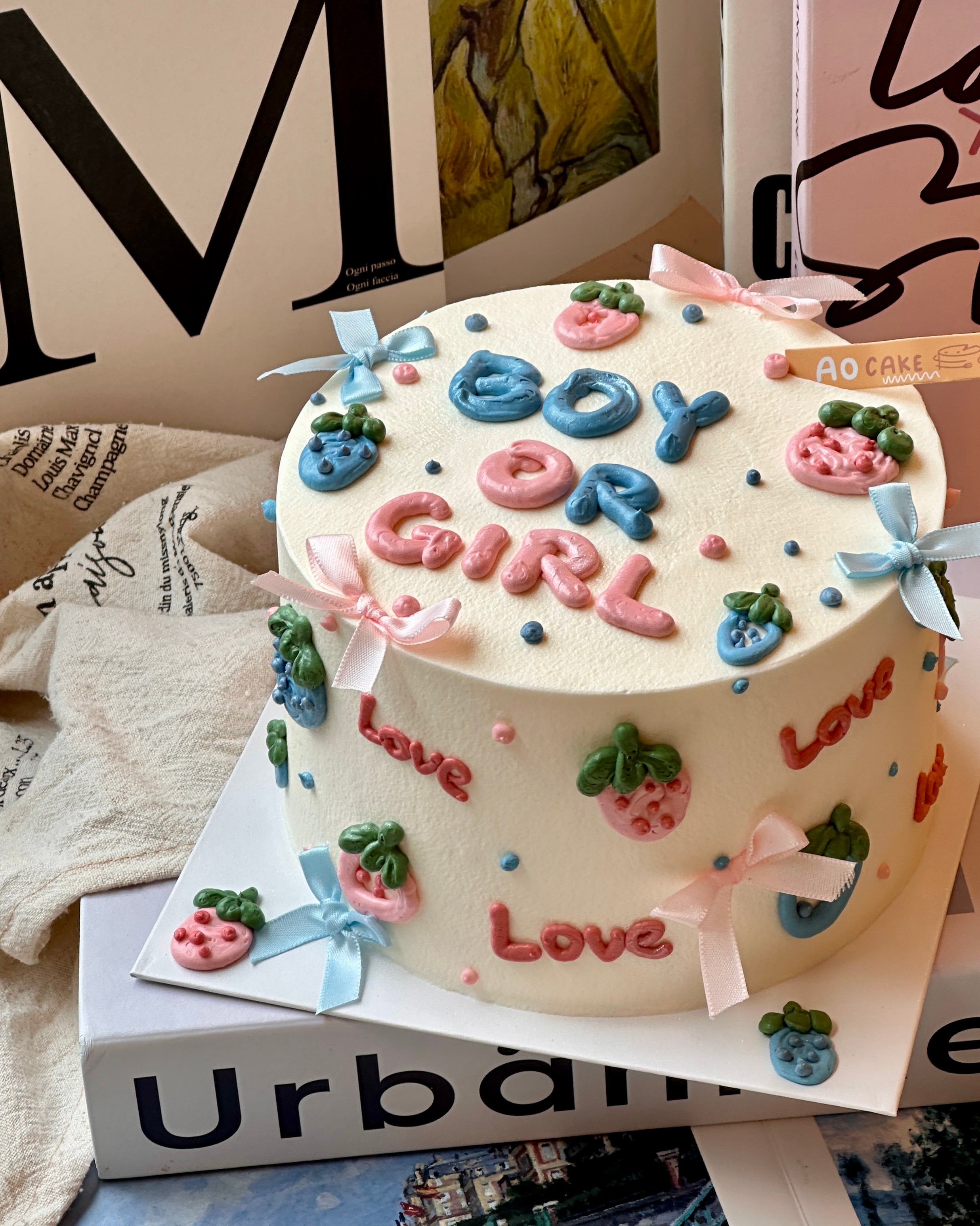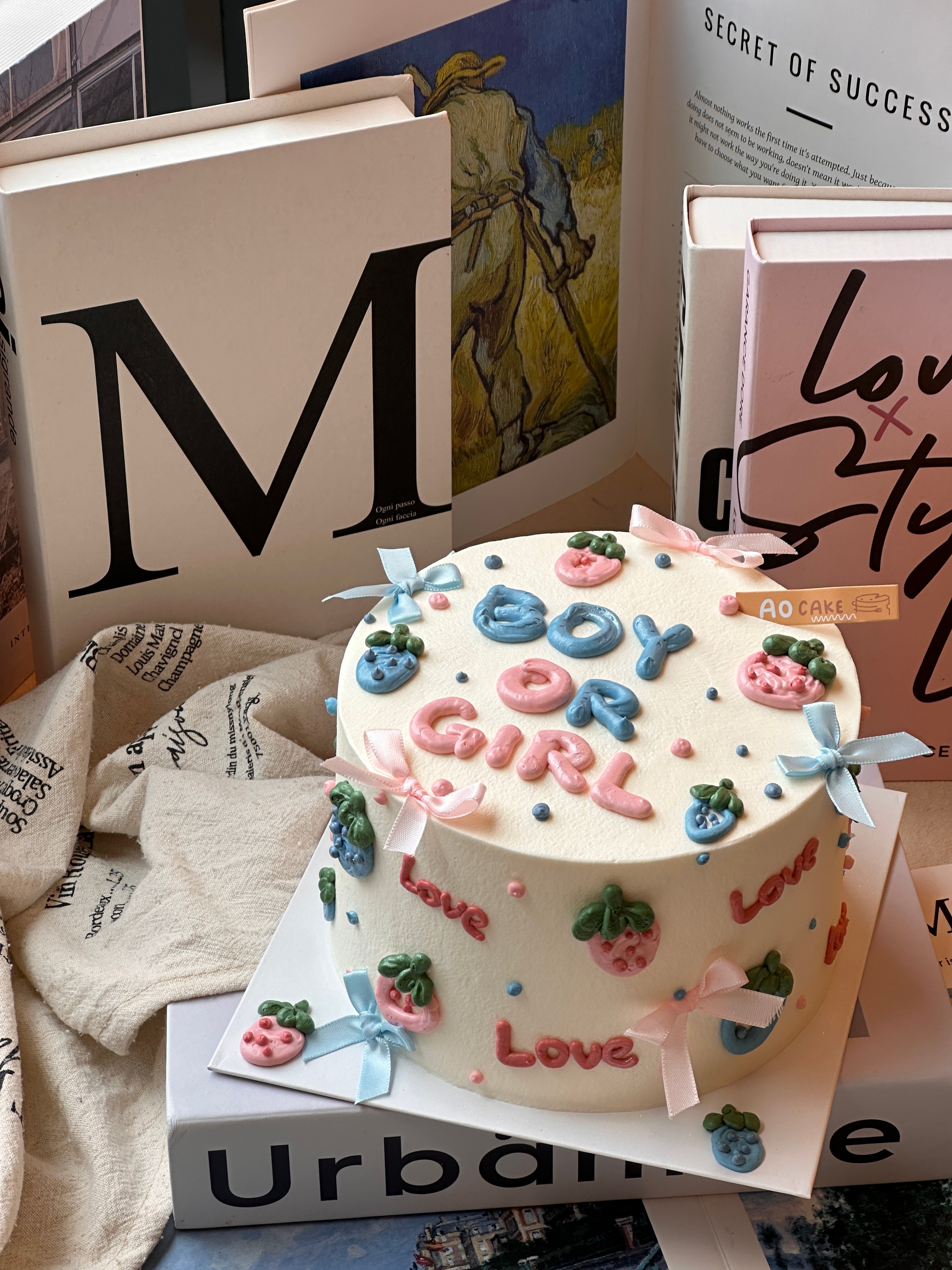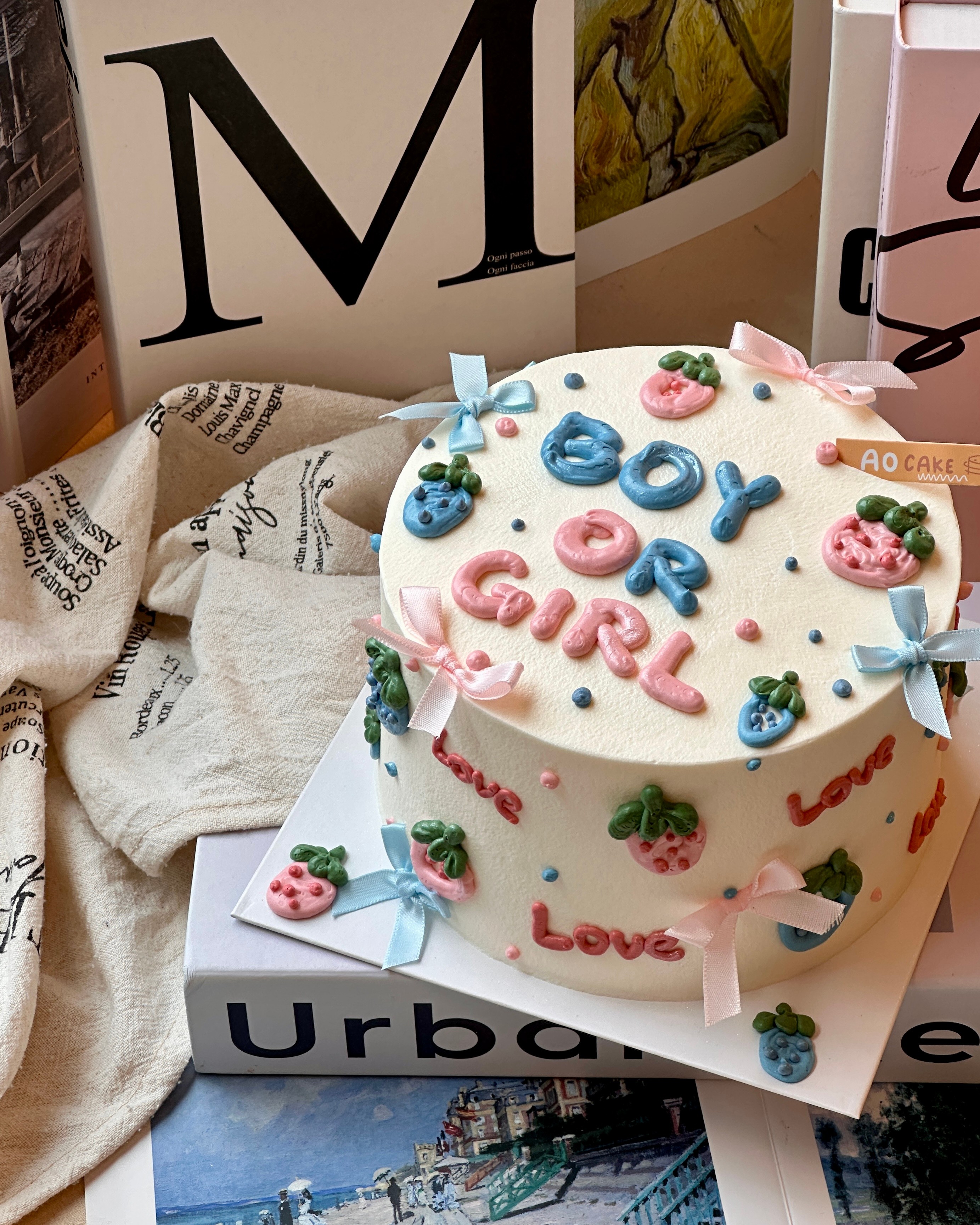 此款蛋糕为鲜奶油蛋糕,文字和小涂鸦为奶油霜成分。 我们会根据您不同尺寸的选择去随机搭配适量的装饰。 注意:由于性别蛋糕需要揭示性别的特殊性,因此将会制作为香草口味夹心。 下单时请选择夹心颜色:女孩为粉色,男孩为蓝色。