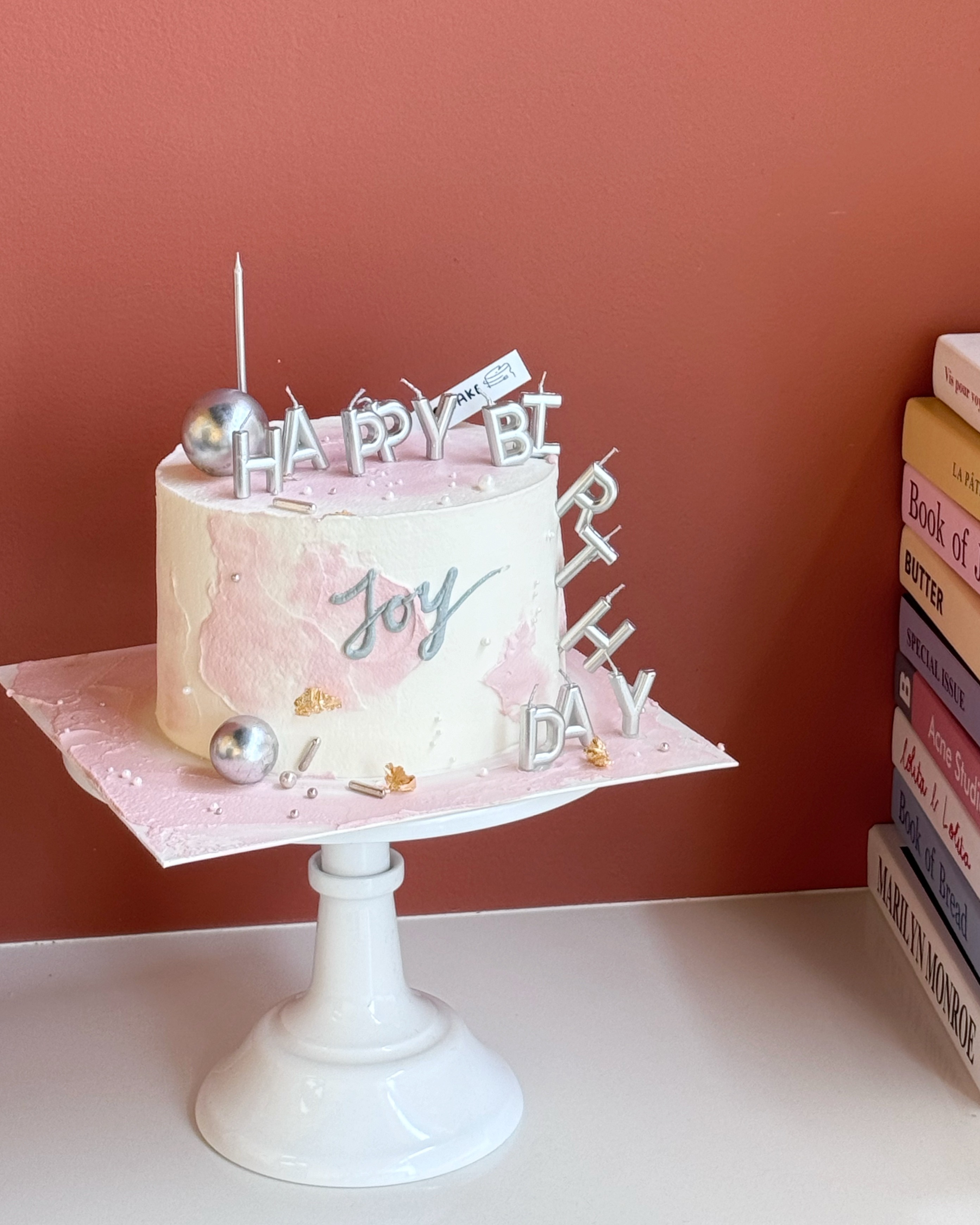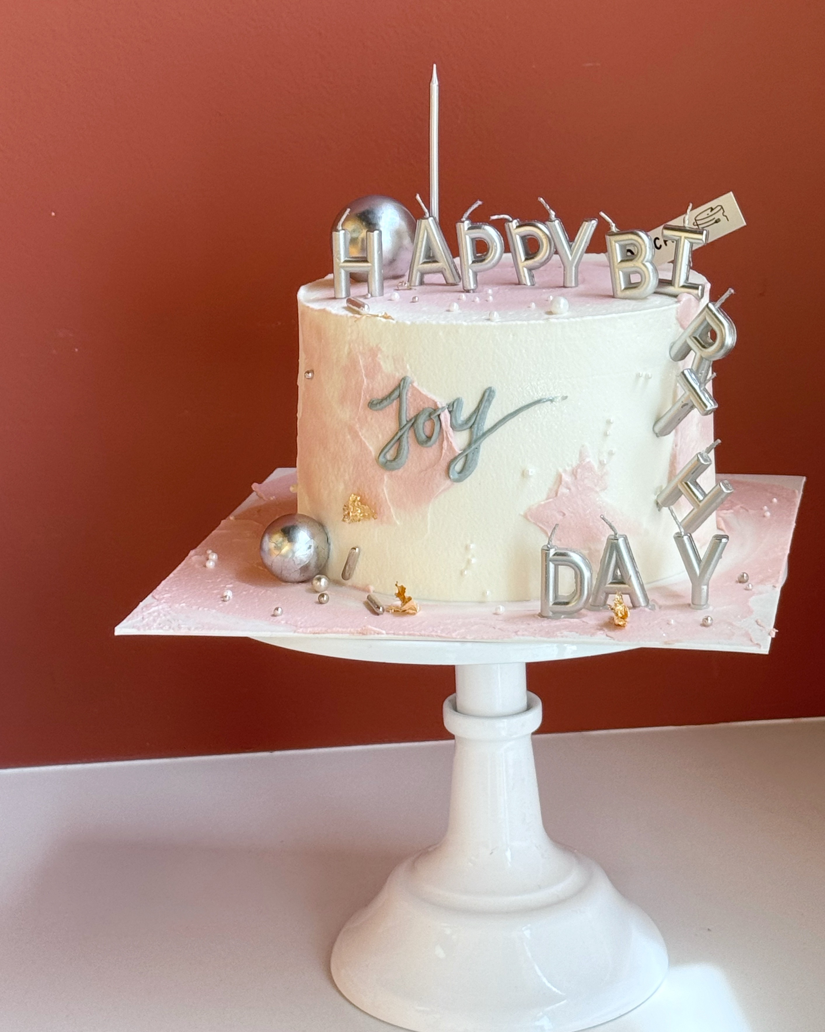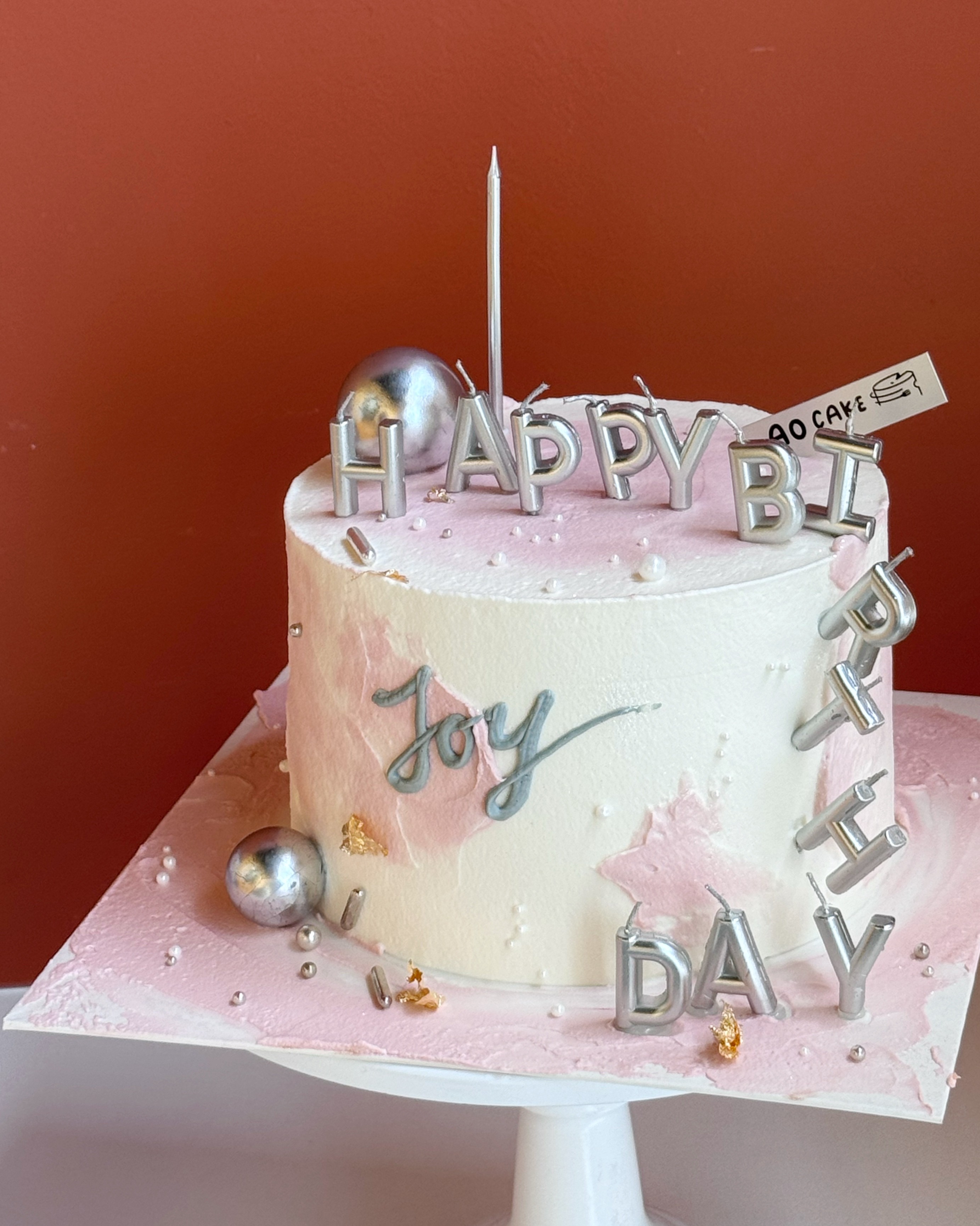 此款蛋糕为鲜奶油蛋糕,文字部分为奶油霜成分。 我们会根据您不同尺寸的选择去随机搭配适量的装饰。 注意:图片中的“Happy Birthday”为蜡烛;图片中的“Joy”为客人名字,制作此款蛋糕的时候我们不会和图片一样在蛋糕上写名字,如果您需要添加名字请在下单界面备注。