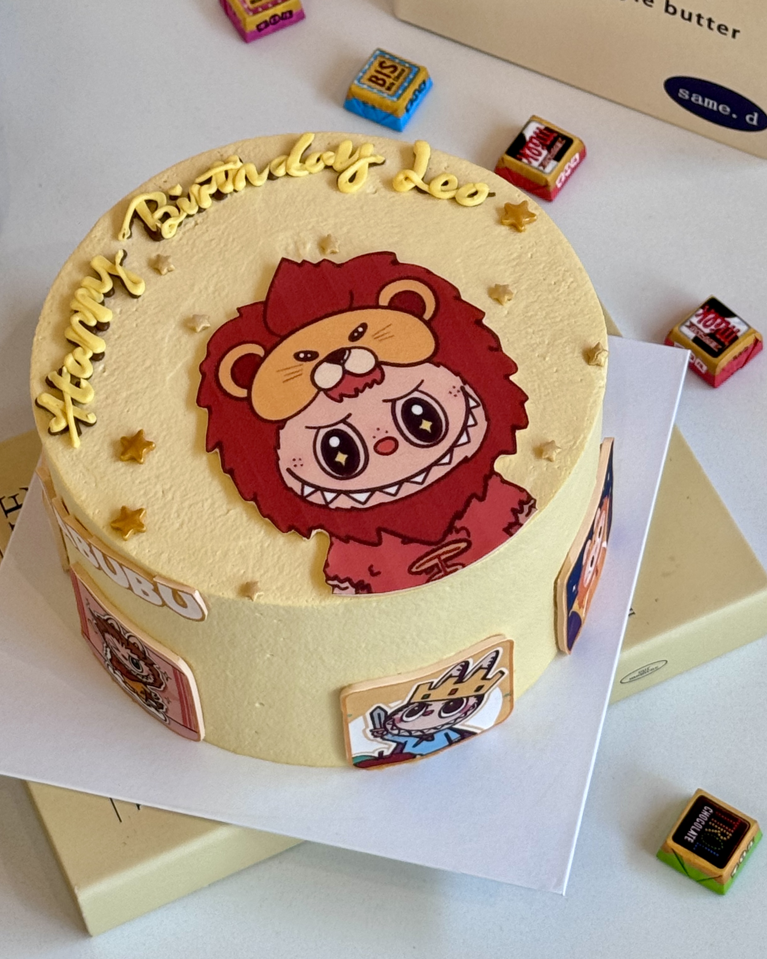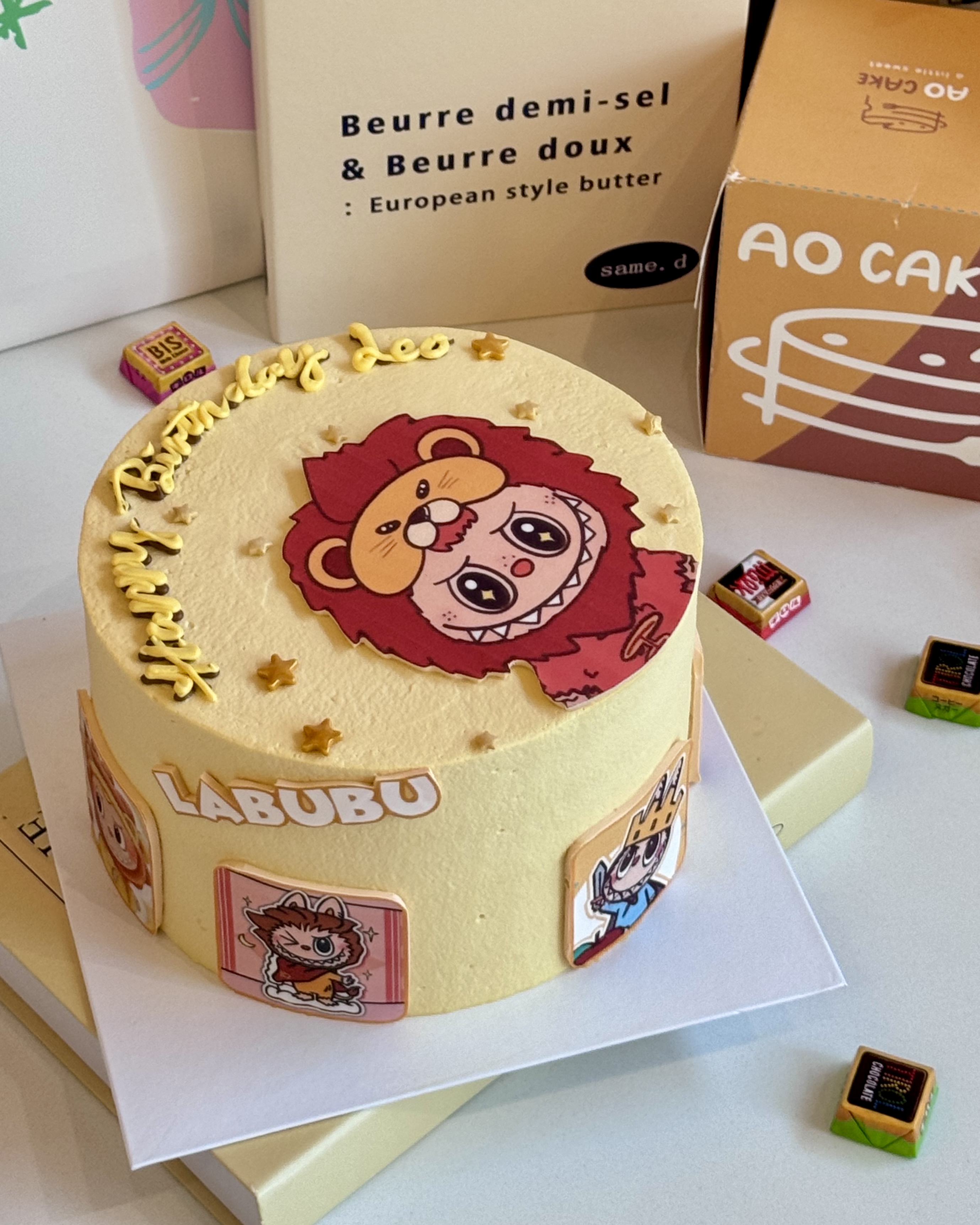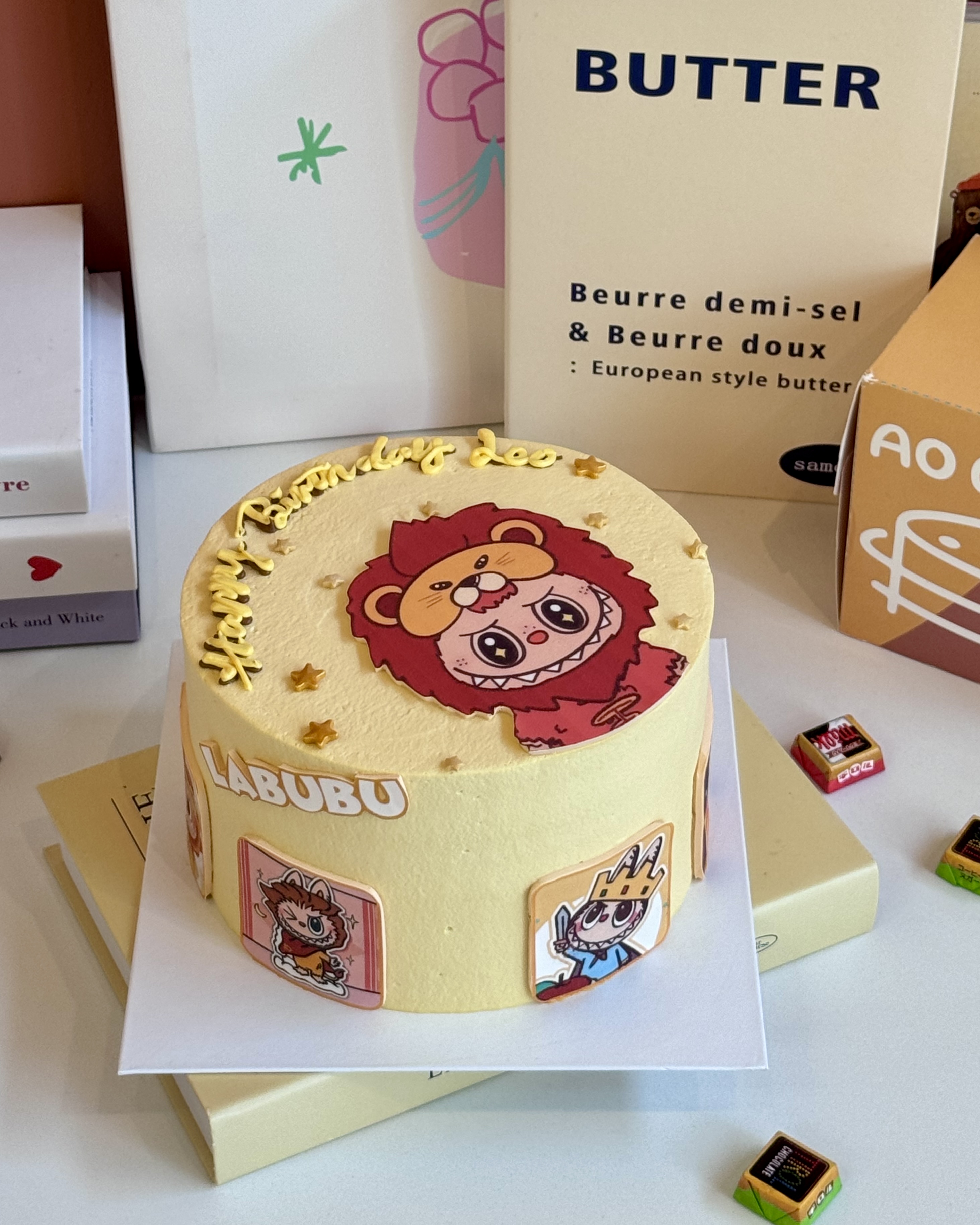 此款蛋糕为鲜奶油蛋糕,文字为奶油霜成分。 我们会根据您不同尺寸的选择去随机搭配适量的装饰。 注意:图片中的Labubu图片为可食用的糯米纸材质, 糯米纸虽然是可食用材料,但本身并没有什么味道;如果您不想吃的话可以揭下来。 该蛋糕将会包括顶部和侧面一共6个糯米纸图片。