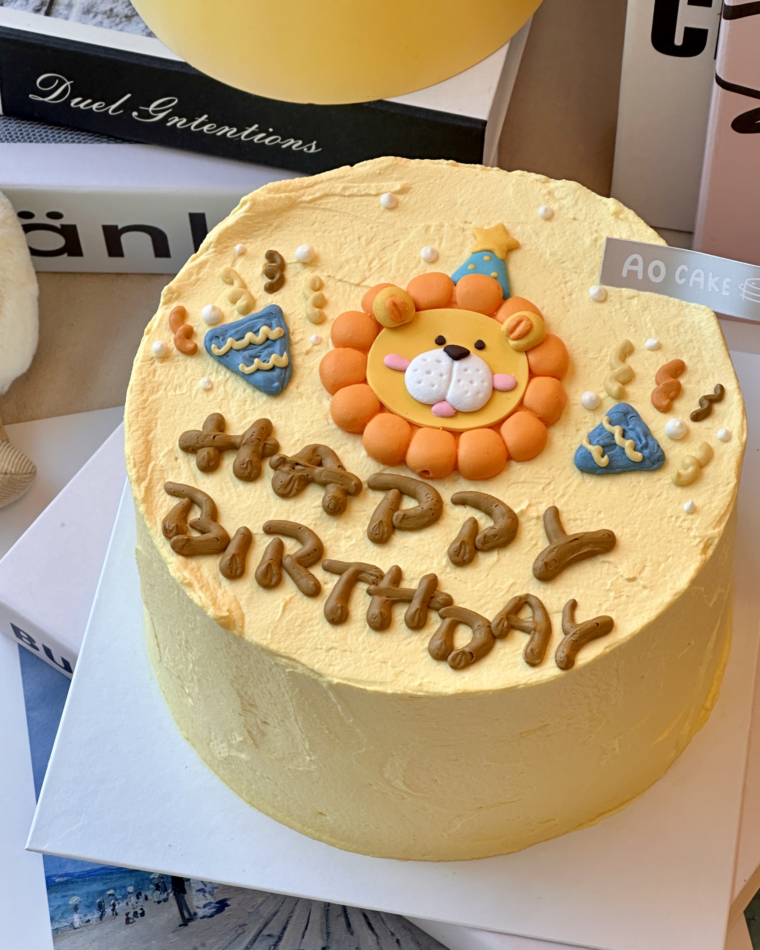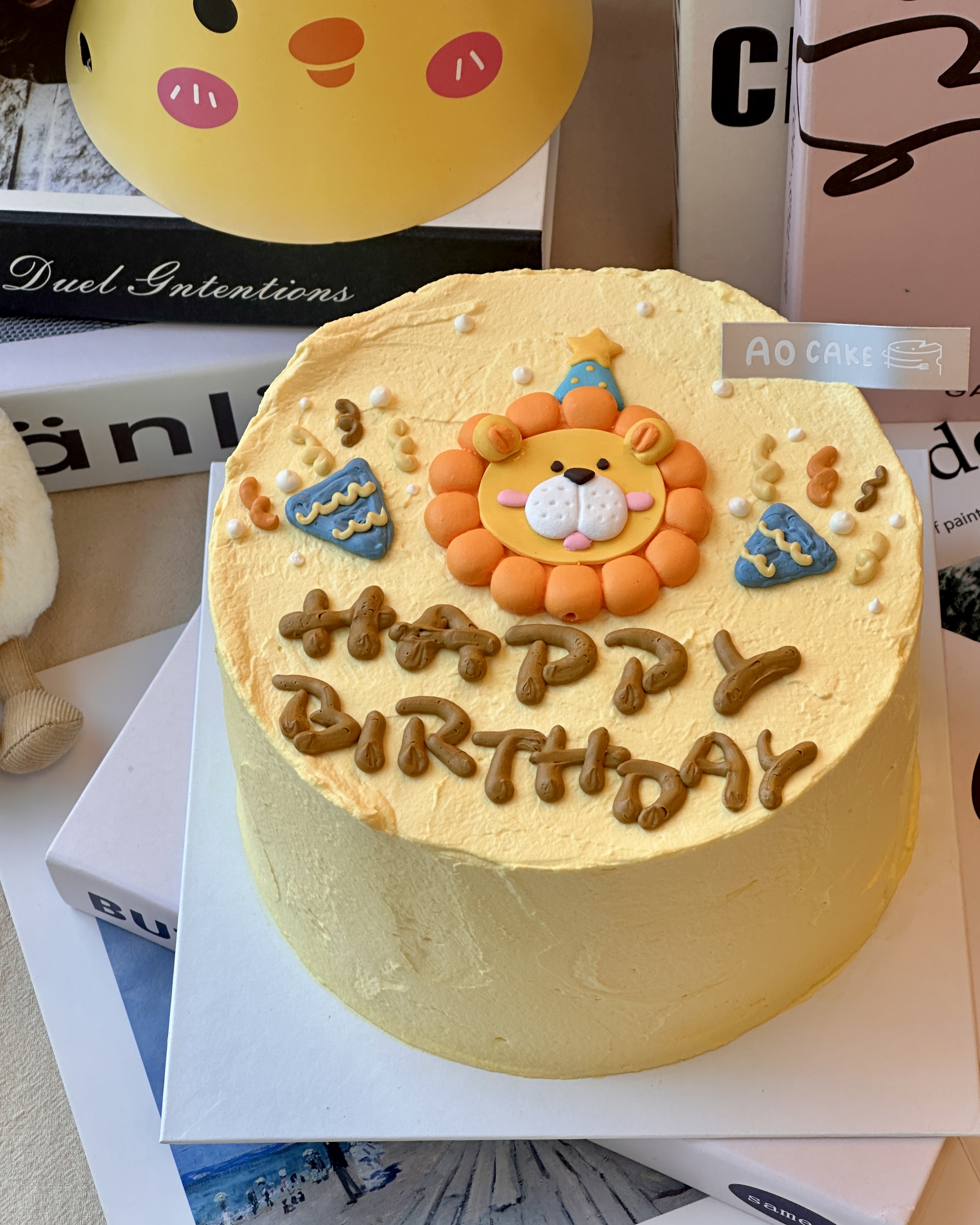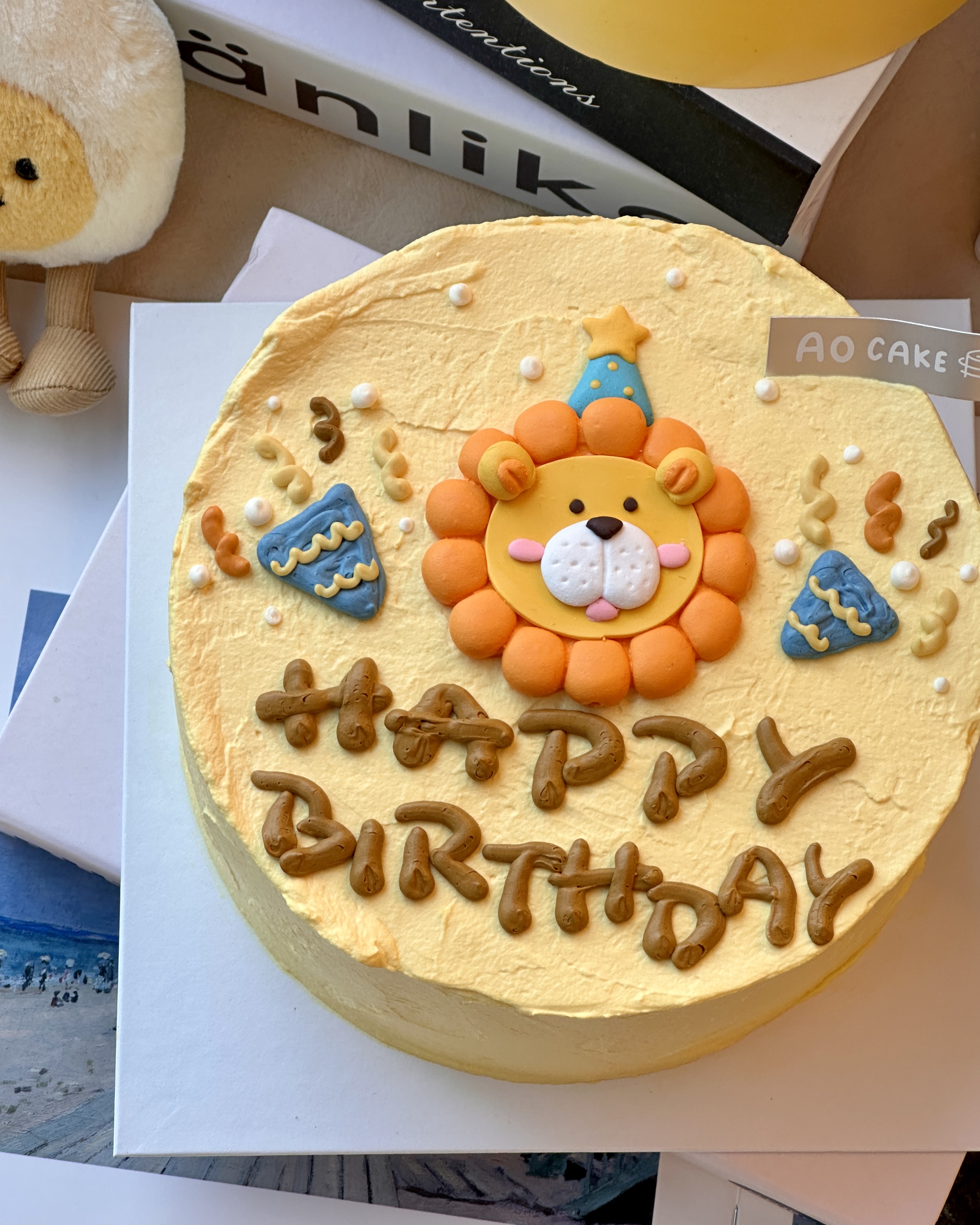 此款蛋糕为鲜奶油蛋糕,文字和小涂鸦为奶油霜成分。 我们会根据您不同尺寸的选择去随机搭配适量的装饰。 注意:此款蛋糕中间狮子为摆件且不可食用。