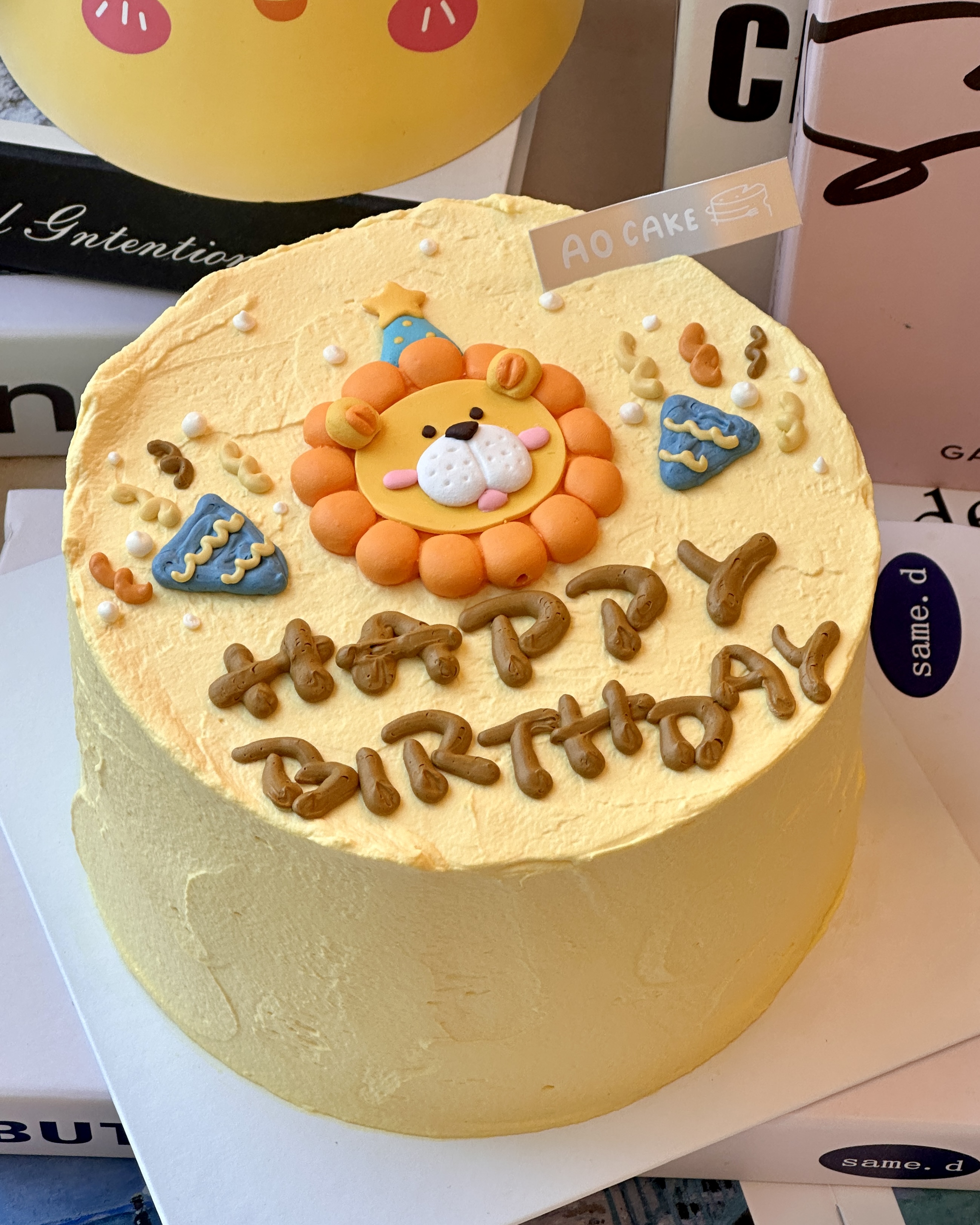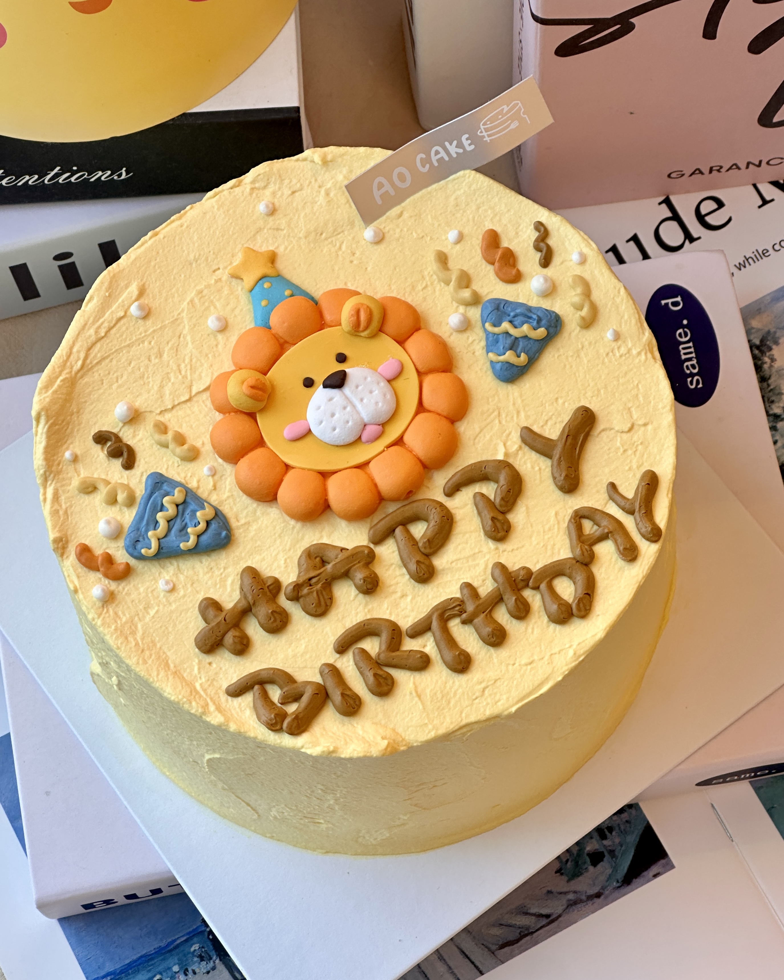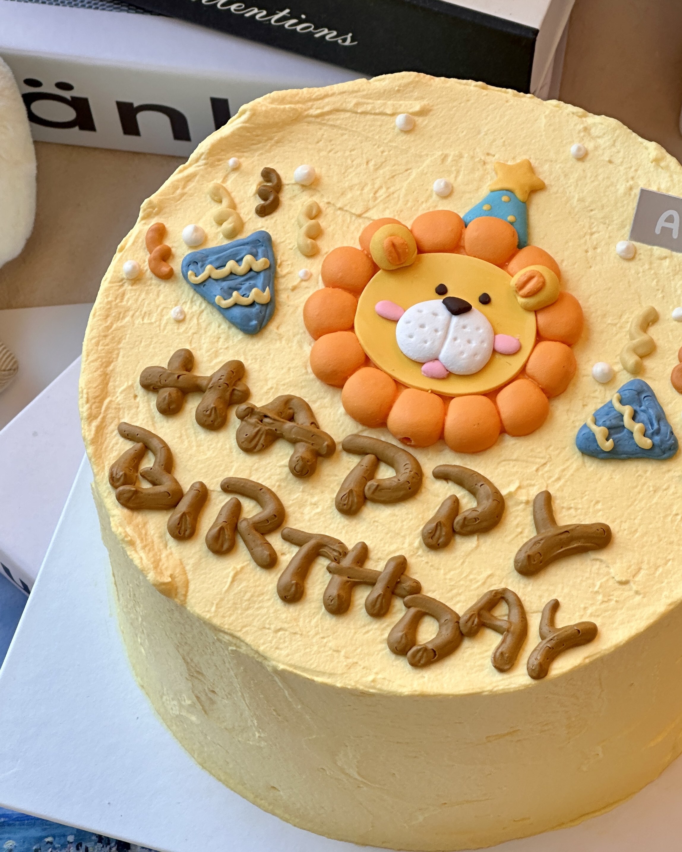 此款蛋糕为鲜奶油蛋糕,文字和小涂鸦为奶油霜成分。 我们会根据您不同尺寸的选择去随机搭配适量的装饰。 注意:此款蛋糕中间狮子为摆件且不可食用。