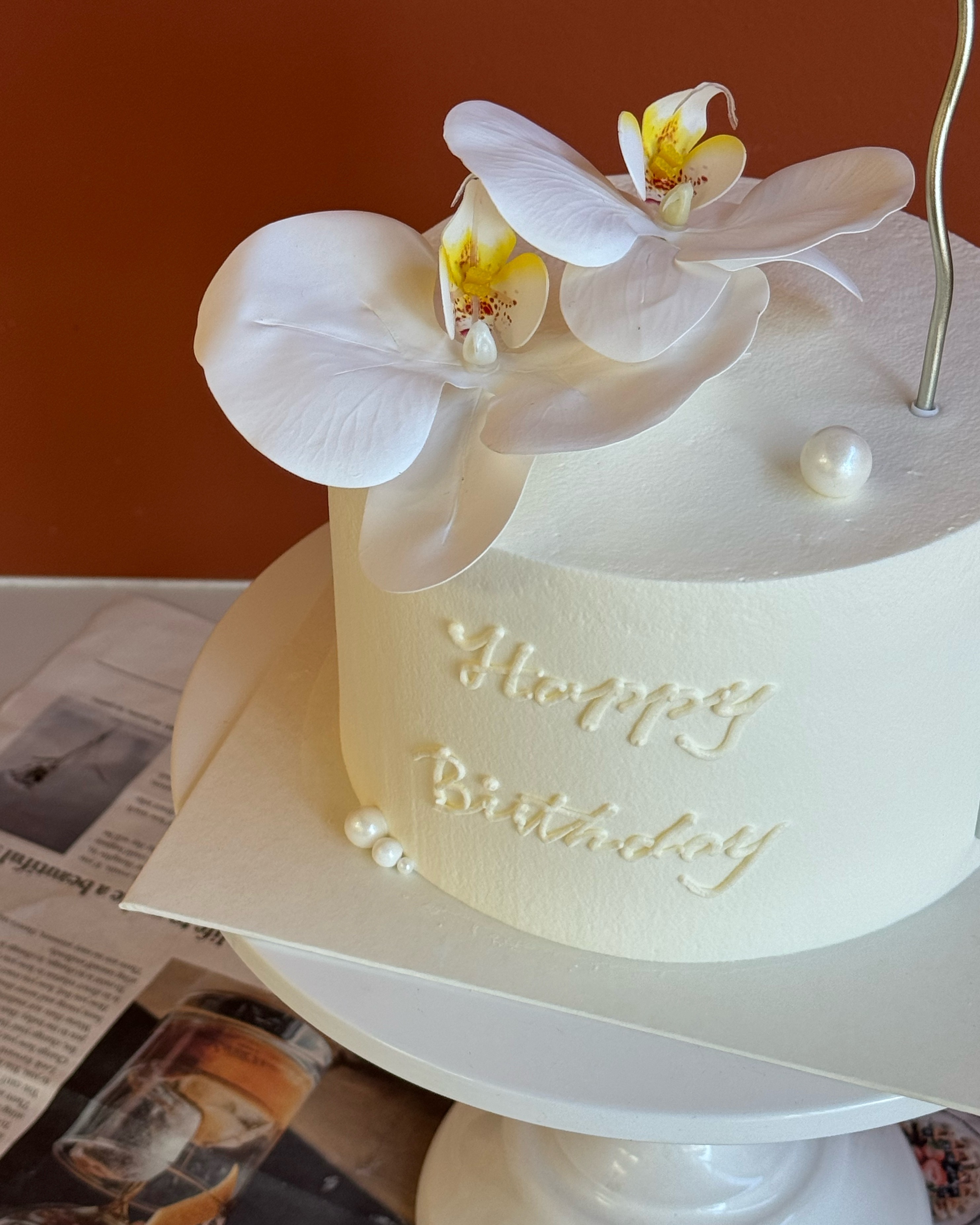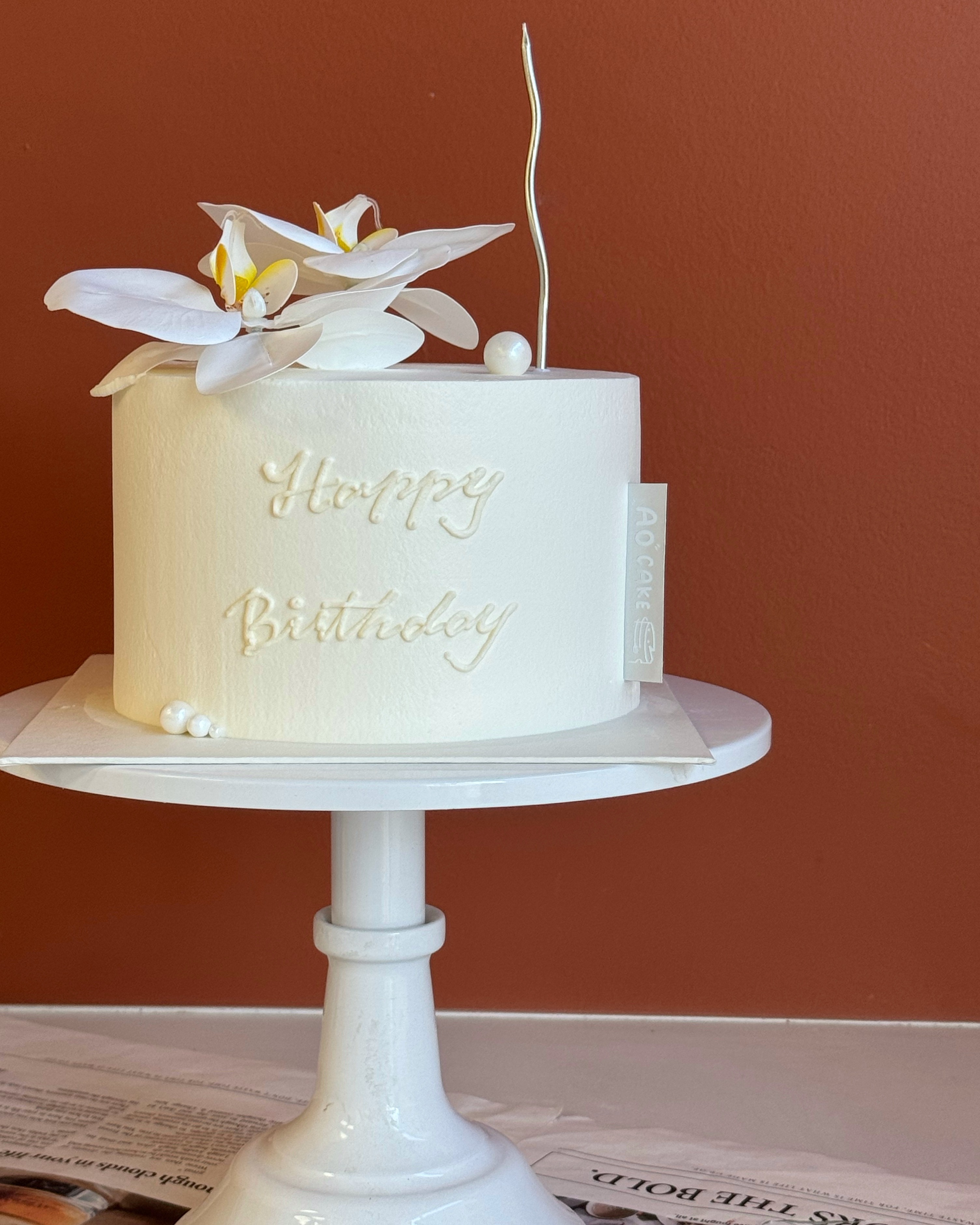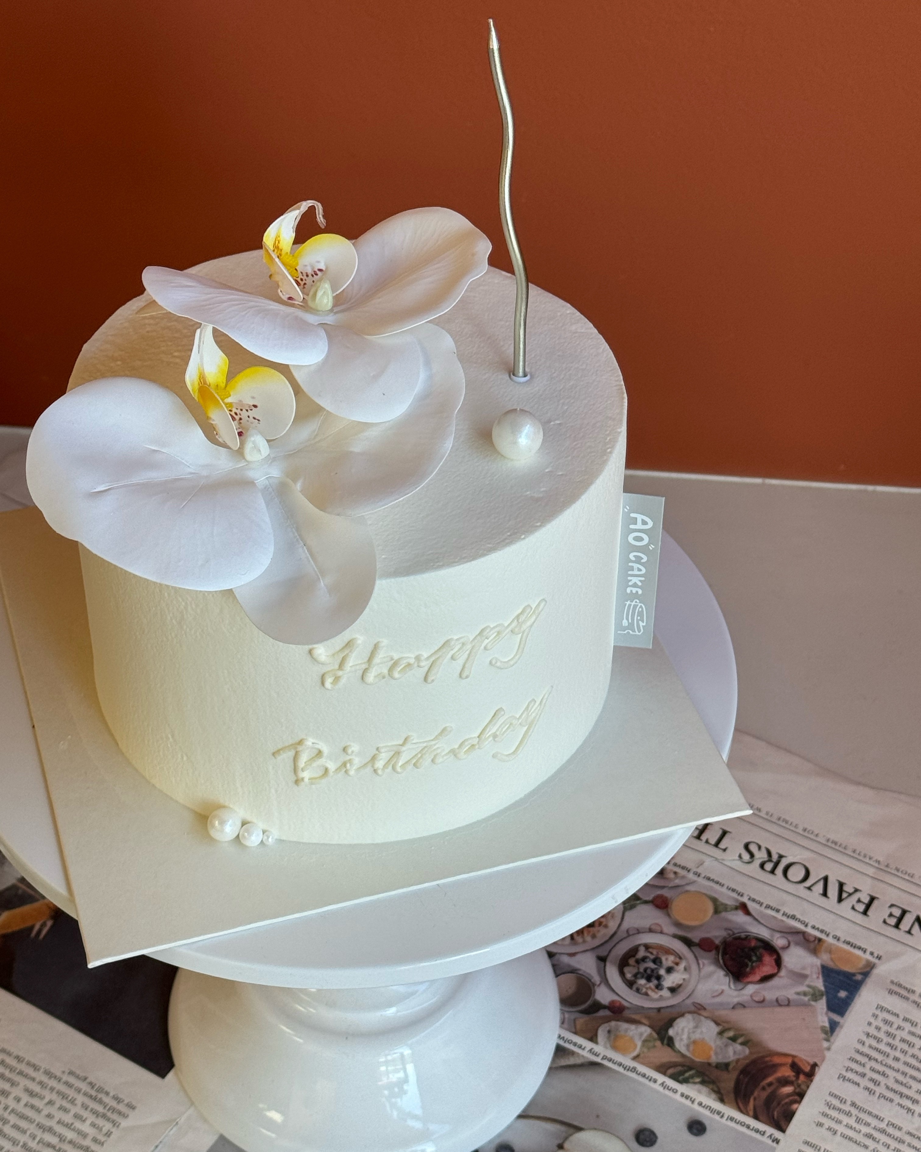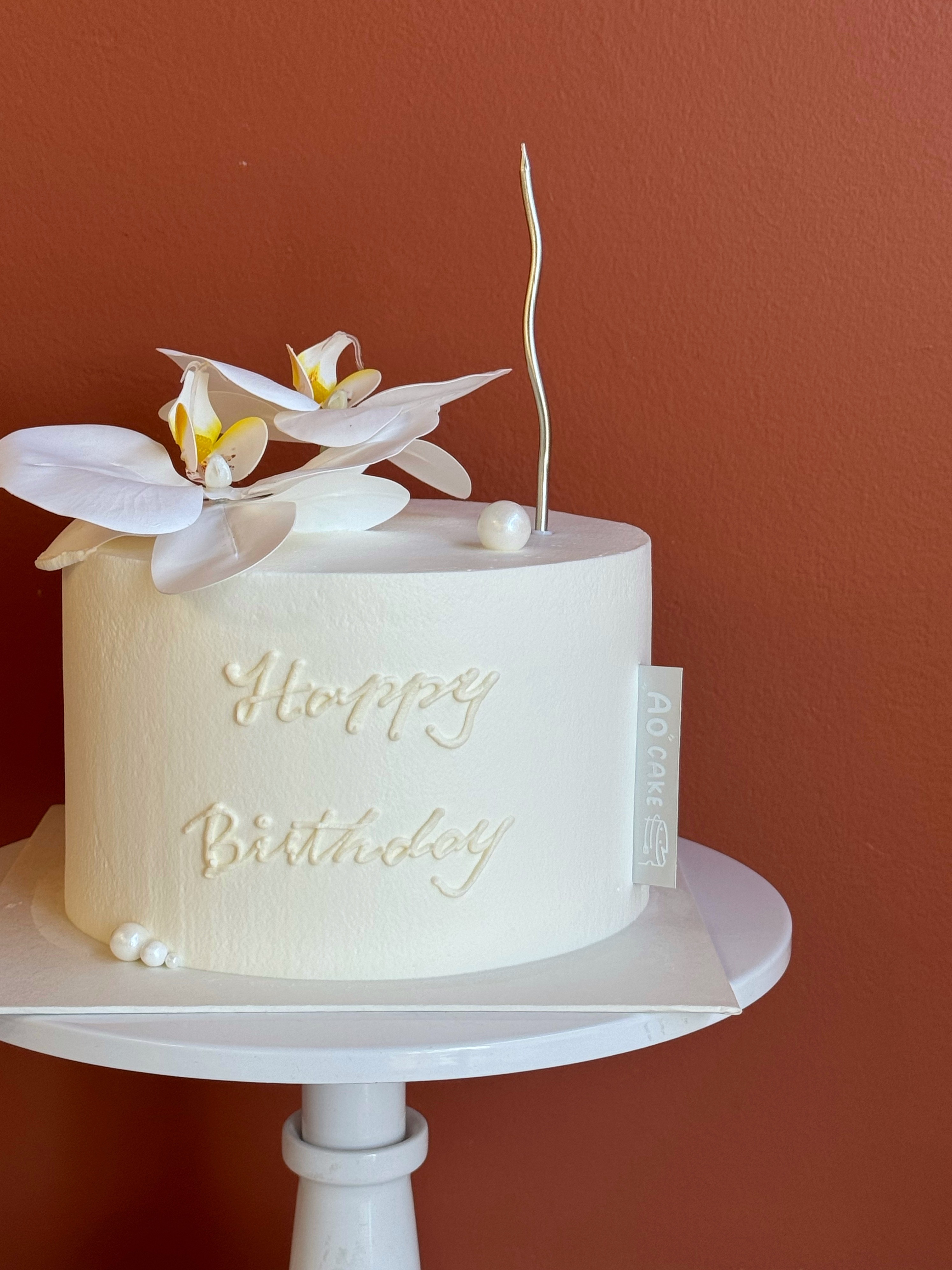 此款蛋糕为鲜奶油蛋糕,文字为奶油霜成分。 我们会根据您不同尺寸的选择去随机搭配适量的装饰。 注意:此款蛋糕的蝴蝶兰为仿真花,不是真花。