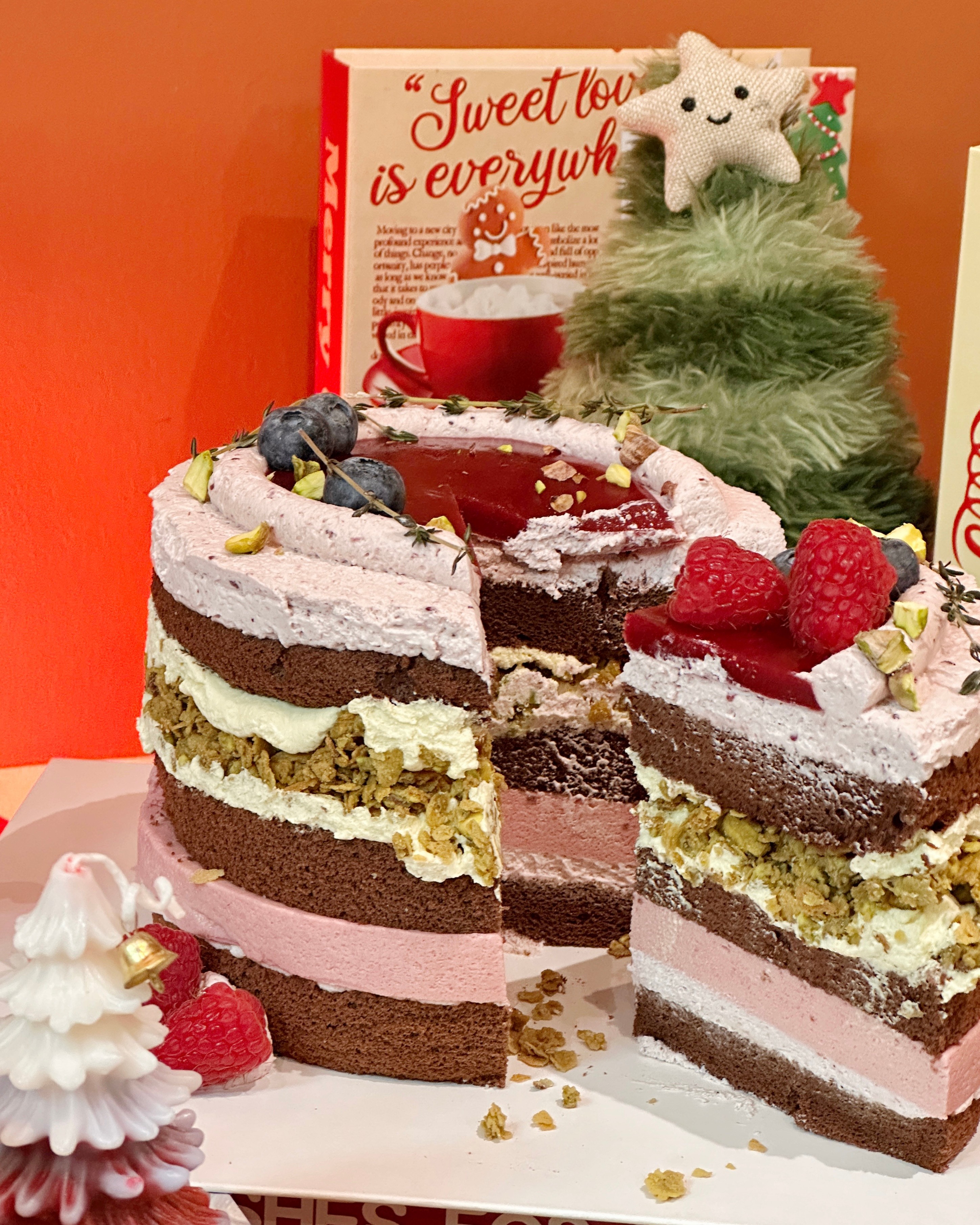2025年AO Cake冬季限定。 穿过绿色的开心果奶油,树莓的粉色乍现眼前。 以整颗开心果制作的开心果脆脆底,入口轻脆并带着香气沉沉的浓郁坚果香,这恰好与柔软微酸的树莓慕斯形成最巧妙的平衡。 浓郁但不厚重,清爽但有层次。