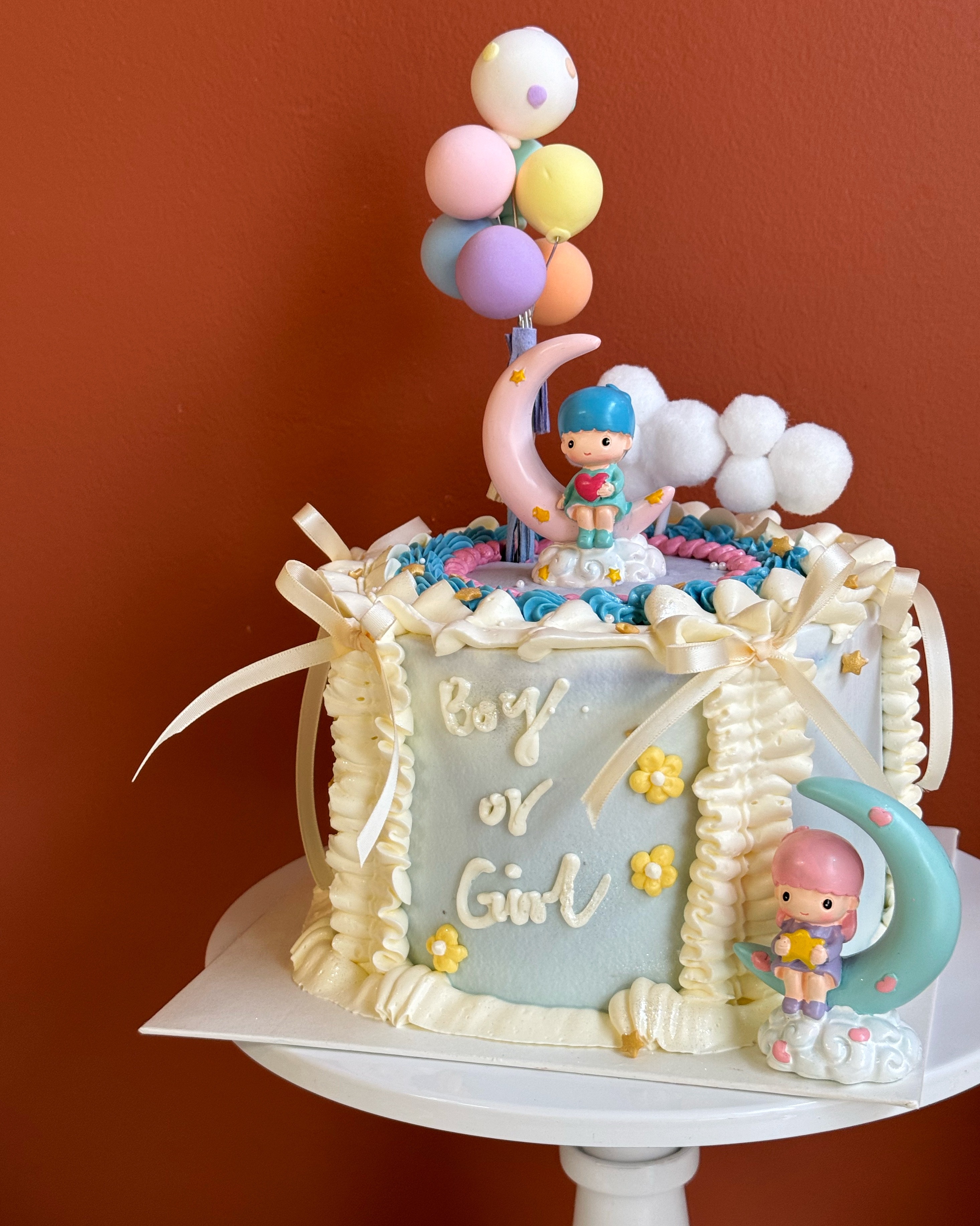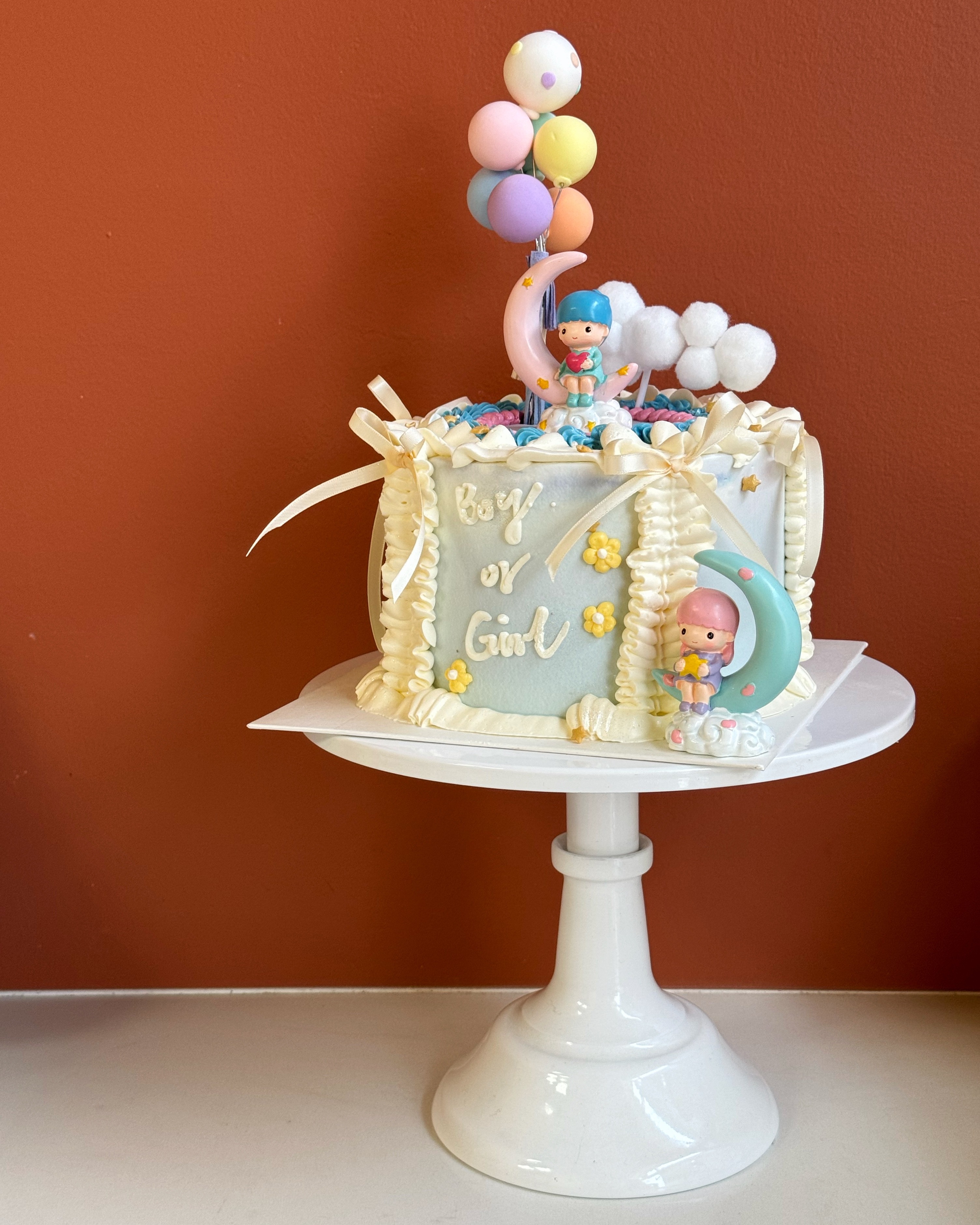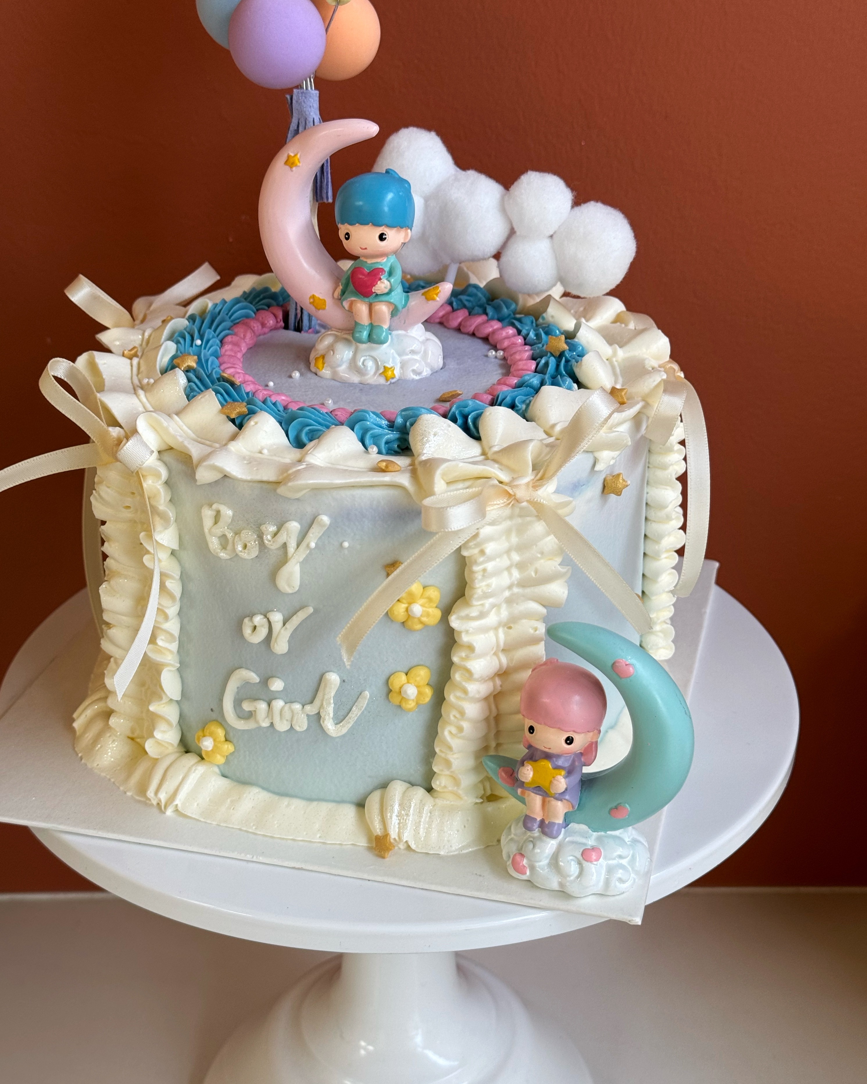 此款蛋糕为鲜奶油蛋糕,侧面裱花和文字为奶油霜成分。 我们会根据您不同尺寸的选择去随机搭配适量的装饰。 注意:由于性别蛋糕需要揭示性别的特殊性,因此将会制作为香草口味夹心。 下单时请选择夹心颜色:女孩为粉色,男孩为蓝色。